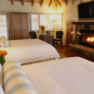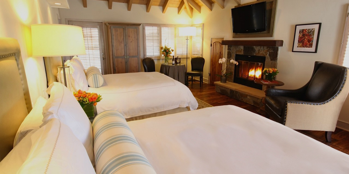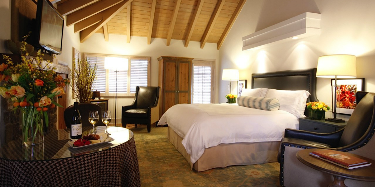 Unwind and relax in one of our eighty guestrooms, eight mini-suites or four private villas that blend stylish comfort with modern conveniences. Elegant French antique furnishings are complimented with plush bedding for a comfortable, exquisite slumber. The luxuriously tiled bathrooms featuring dual ceramic sinks and an oversized sunken whirlpool jetted bathtub for two are perfect for a rendezvous for madame et monsieur. All accommodations also include balconied or private garden patios, wood-burning fireplaces and our signature complimentary bottle of The Messenger il postino Sauvignon Blanc from Napa Valley winemaker Rob McDonald to enjoy in a cozy and inviting sitting area.