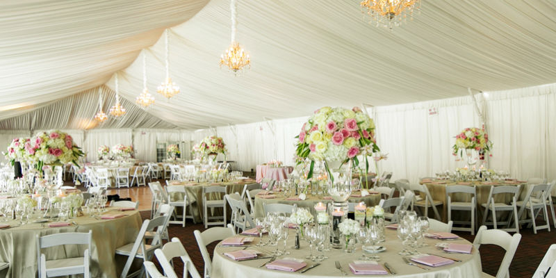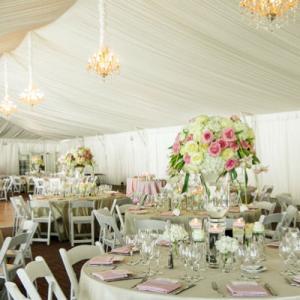 The second location is the Moonlight Grove Ceremony and Reception site, a beautiful rose-decked arbor at one end of a lawn with thick green grass lined with trees. The lawn fans out from an enormous, shimmering white tent where receptions are held. Inside, the venue is all graceful billows and folds of white draping, with crystal chandeliers - the perfect ambient setting for your ultimate wine country wedding experience. The tent is set up around a permanent brick floor, and you can have the numerous side panels opened or closed as you like.