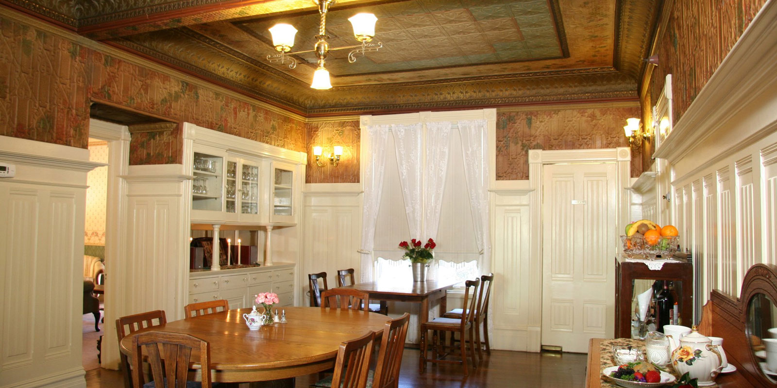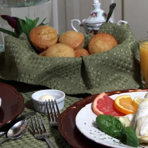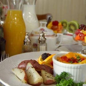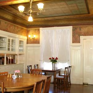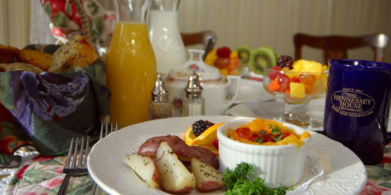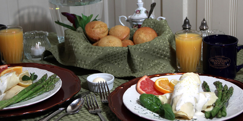Hennessey House does not charge resort fees. Our guests may enjoy an array of complimentary services including a full homemade breakfast served daily. Unlike many establishments who offer a standard breakfast buffet each morning, Hennessey House offers a different breakfast menu each morning. Stay with us seven days and you will experience a different breakfast each morning prepared from scratch by owner Lorri Walsh or one of our wonderful innkeepers.Some or our guest’s favorite Main Courses include Crepes Florentine with asparagus in an orange butter sauce, Tarragon leek eggs with garden seasoned potatoes, and our special Decadent French Toast with crispy bacon or breakfast sausage. Breakfast options for vegetarian, gluten free, or other special diets are available upon request. Enjoy your breakfast in our unique dining room with original hardwood floor and stunning hand painted stamped tin ceiling.